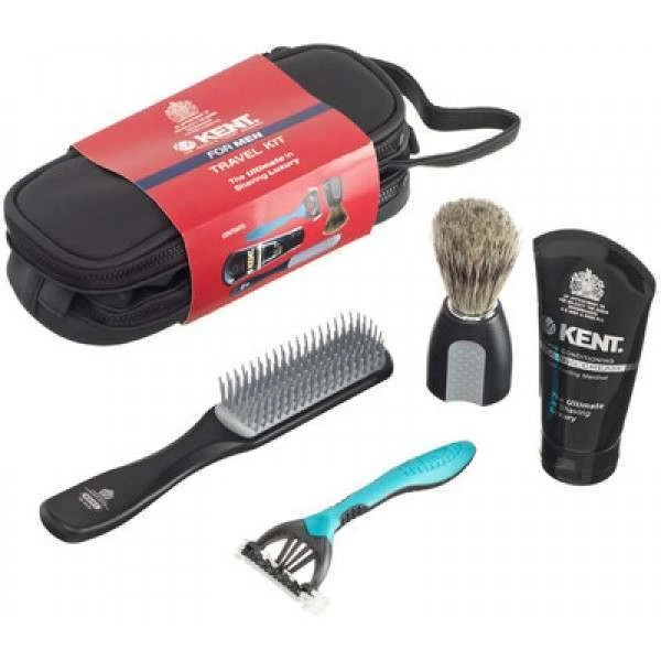 - A great grooming kit for men containing a fantastic blended bristle shaving brush, a tube of Kent’s luxury skin conditioning shaving cream, a Kent For Men hairbrush and a Wilkinson Sword razor all housed in a dual level travel bag.