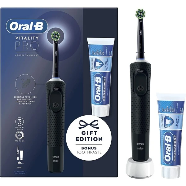 - Rechargeable toothbrush with convenient long-lasting battery.
