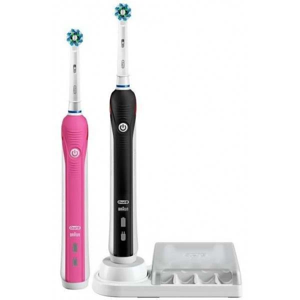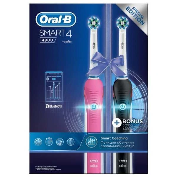 - Bonus pack including 2 Oral-B Smart 4 4900 Electric Rechargeable Toothbrush handles (1 Pink & 1 Black), UK 2 Pin Charger & 2 CrossAction toothbrush heads
