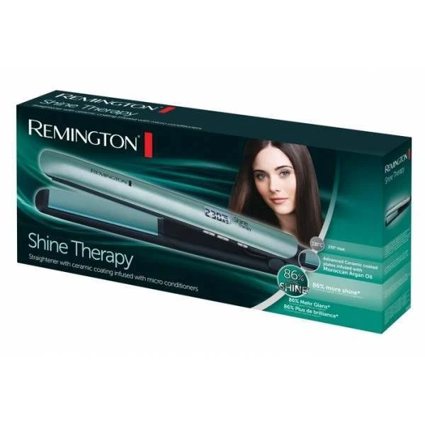 The Remington Shine Therapy hair straightener features advanced ceramic-coated plates, infused with Moroccan Argan Oil; a natural ingredient that has hit the hair industry by storm, with shine enhancing properties and Vitamin E for well nourished and naturally shiny hair.